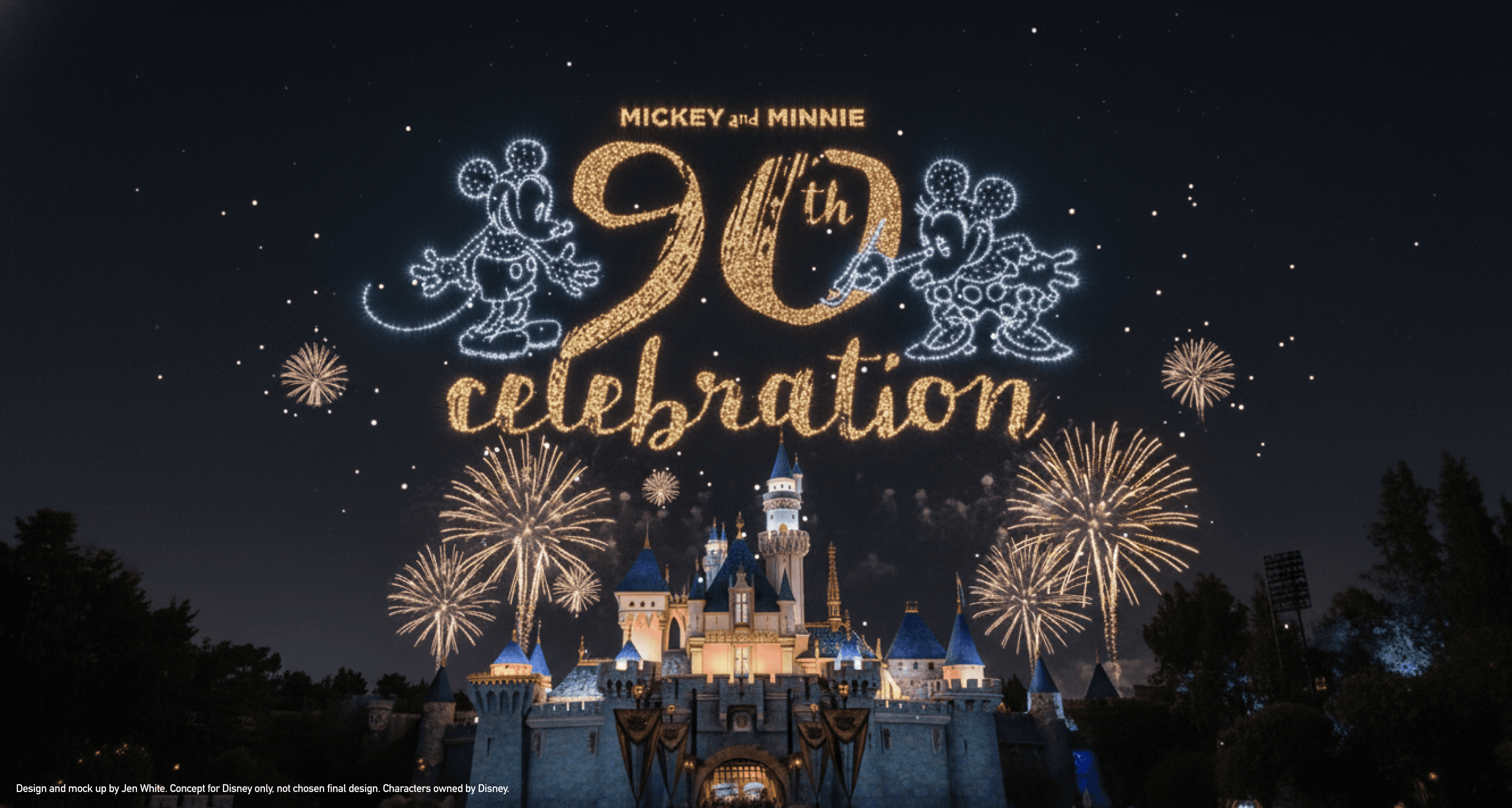 Conceptually, I was drawn to the idea of Minnie painting the anniversary mark in gold, with Mickey admiring her nearby—a subtle nod to their shared artistic heritage. For such a milestone celebration, I developed an elevated color palette of rich golds and deep blacks to convey timelessness, celebration, and magic.